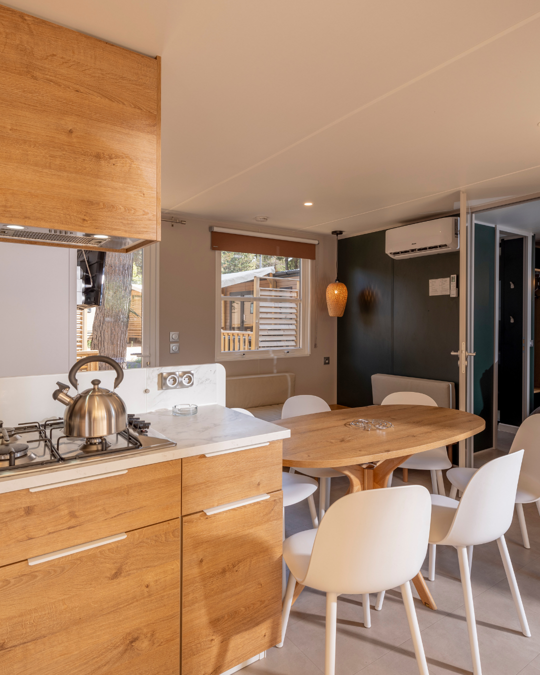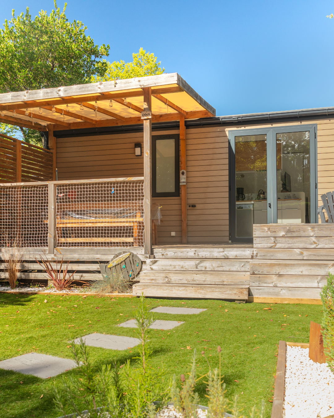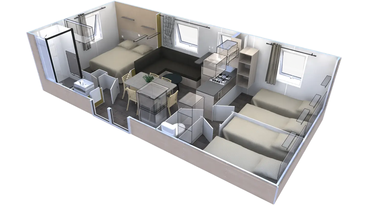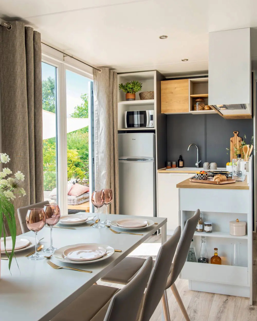 Livrés entièrement équipés, prêts à vivre, avec l’électroménager, la vaisselle, les ustensiles de cuisine et bien sûr la terrasse !
